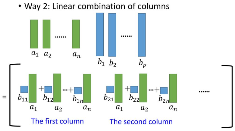 - 즉, 매트릭스 $A$의 열 벡터 $A_i$가 있을 때 이를 B의 각 열 벡터로 선형결합한 것이 $\mathbf C$의 각 열을 구성하게 된다.